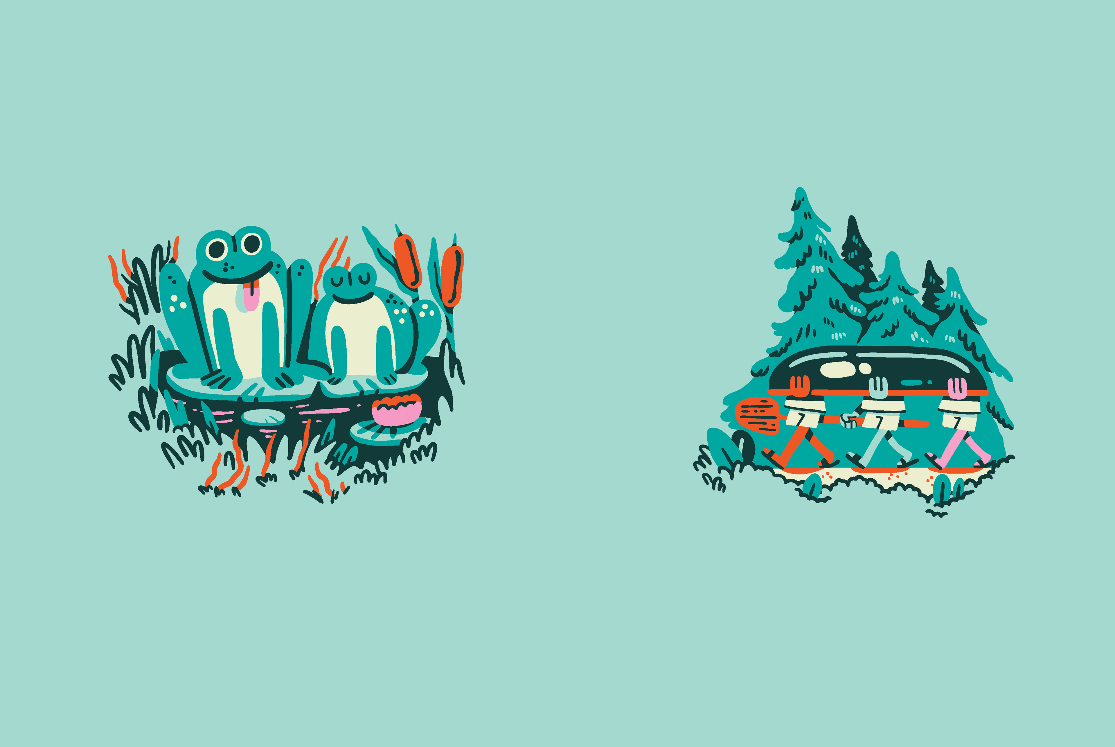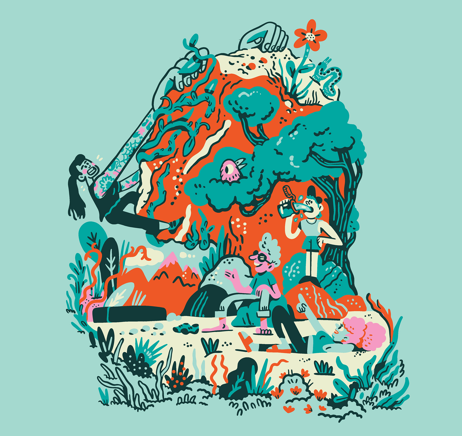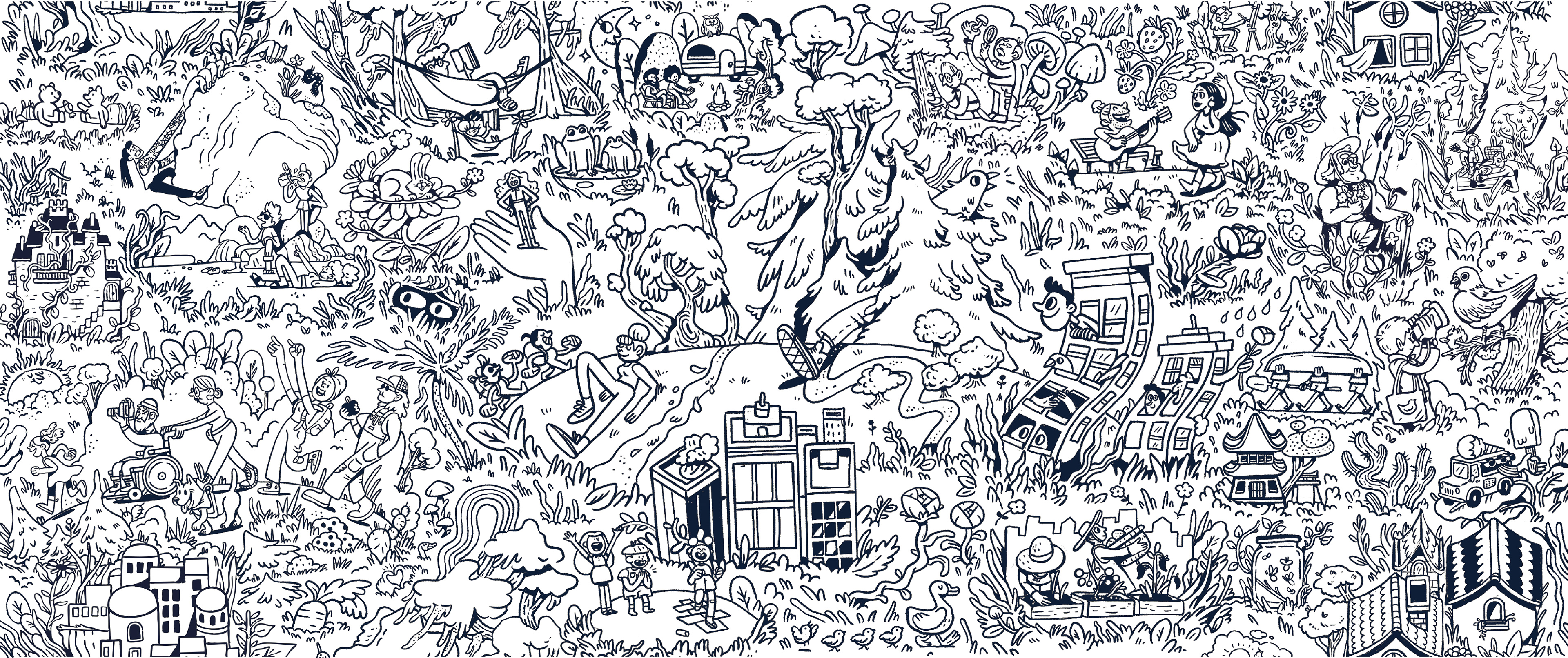The ENO creative crew knew they wanted depictions of community and it's relationship to the outdoors; all the lovely things people can do in nature, even if it's an urban garden or a park surrounded by buildings. After testing out a few ideas, we landed on some sketches for the style that felt right, and I began to build out scene by scene, piecing them together meticulously. As I worked, I found myself resizing multiple times to fit in more people, more fantastical flora, and more activities. This led to the most detailed illustration I've created thus far! I'm stoked they let me go with such a bold color palette, encouraged me to lean into the goofy characters, and ultimately cheered on maximalist ambitions. ENO hammocks are iconic, and I've been a long-time fan of the brand, so getting to collaborate with them was a dream; it was even better that it benefits a meaningful organization.