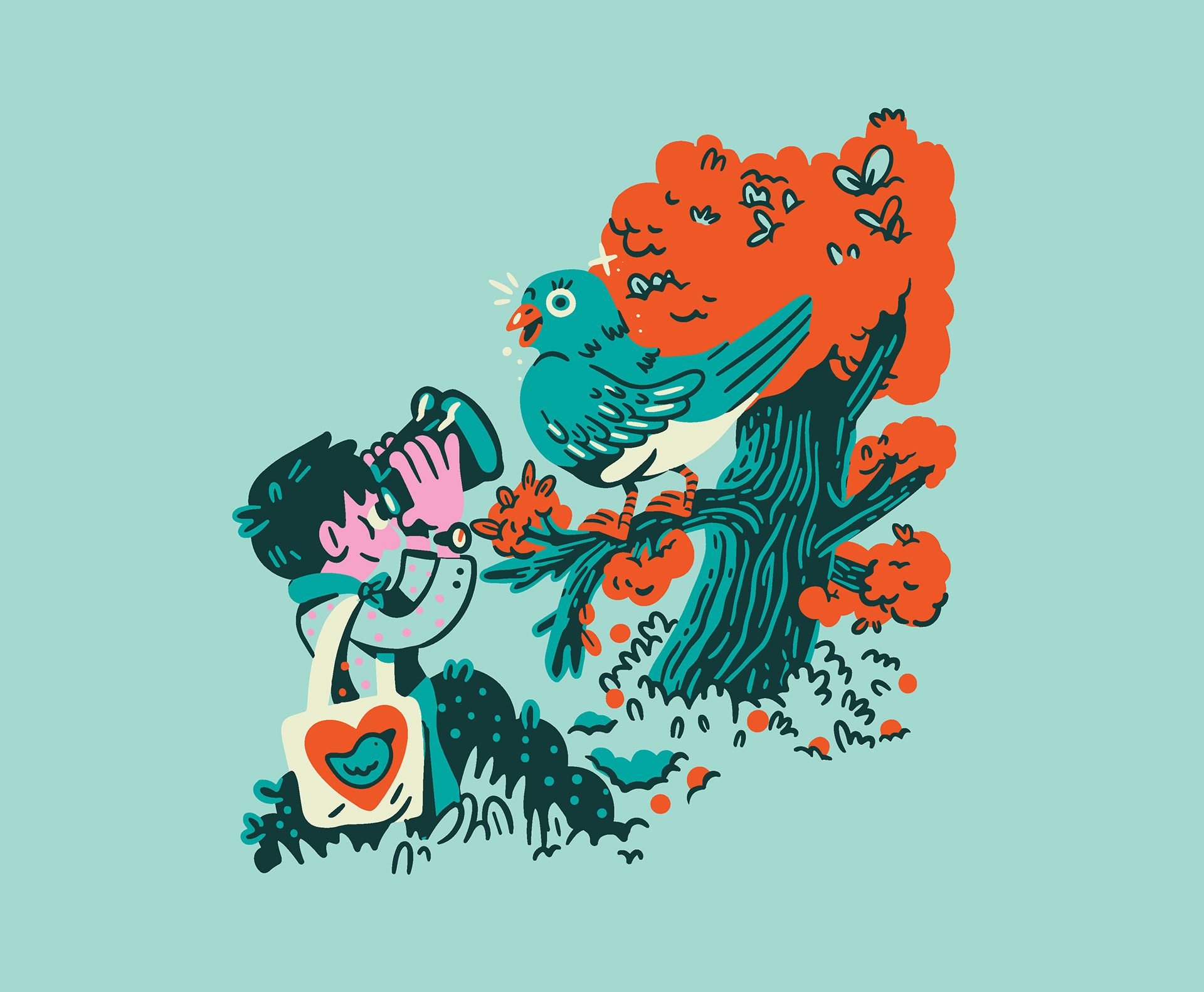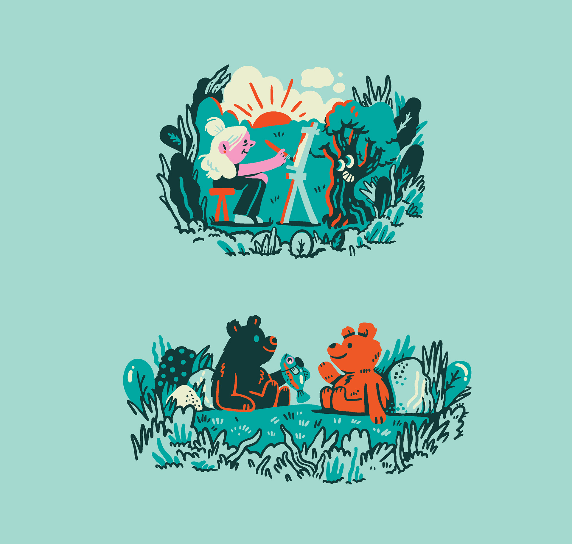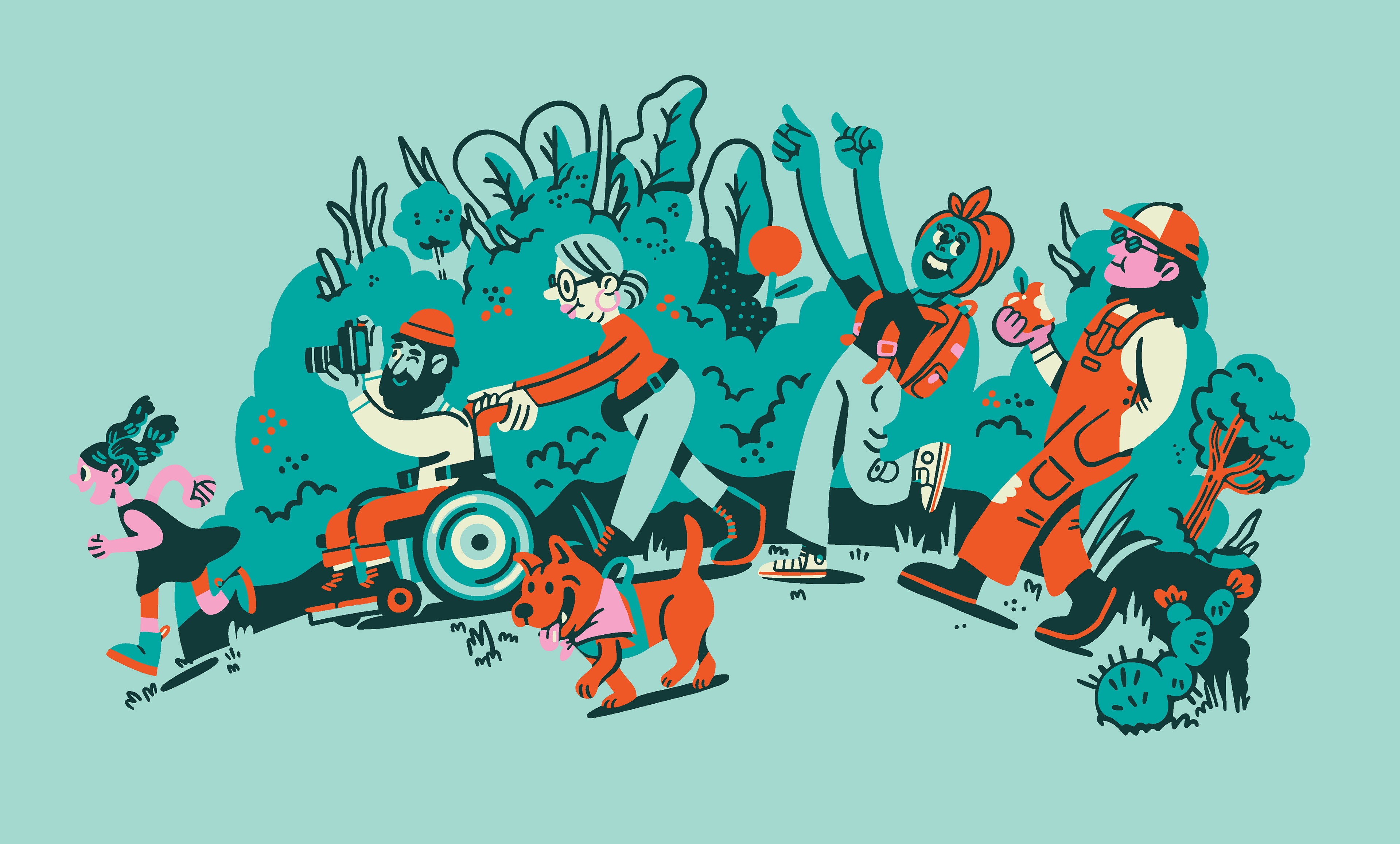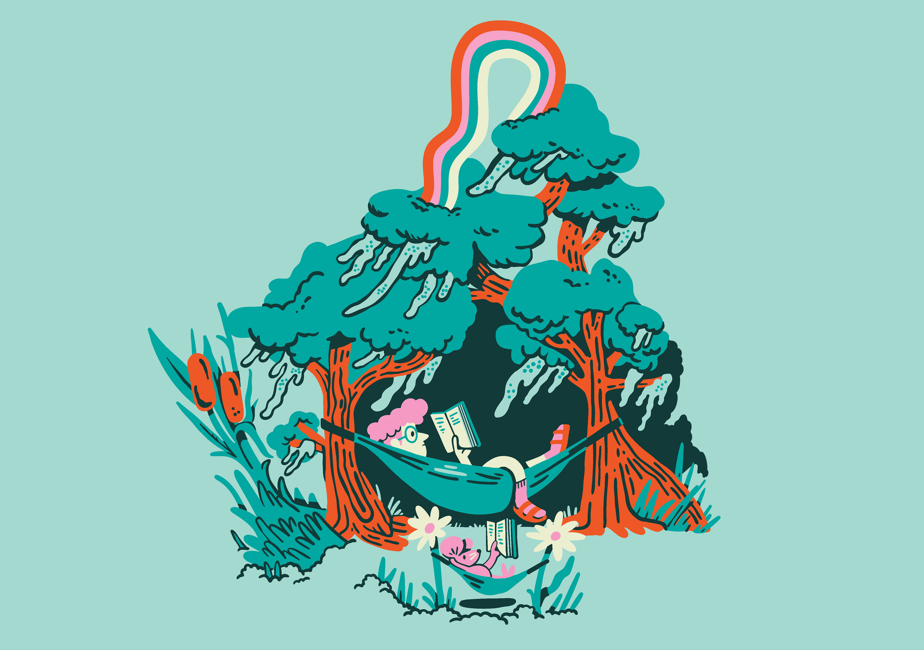 The ENO creative crew knew they wanted depictions of community and it's relationship to the outdoors; all the lovely things people can do in nature, even if it's an urban garden or a park surrounded by buildings. After testing out a few ideas, we landed on some sketches for the style that felt right, and I began to build out scene by scene, piecing them together meticulously. As I worked, I found myself resizing multiple times to fit in more people, more fantastical flora, and more activities. This led to the most detailed illustration I've created thus far! I'm stoked they let me go with such a bold color palette, encouraged me to lean into the goofy characters, and ultimately cheered on maximalist ambitions. ENO hammocks are iconic, and I've been a long-time fan of the brand, so getting to collaborate with them was a dream; it was even better that it benefits a meaningful organization.