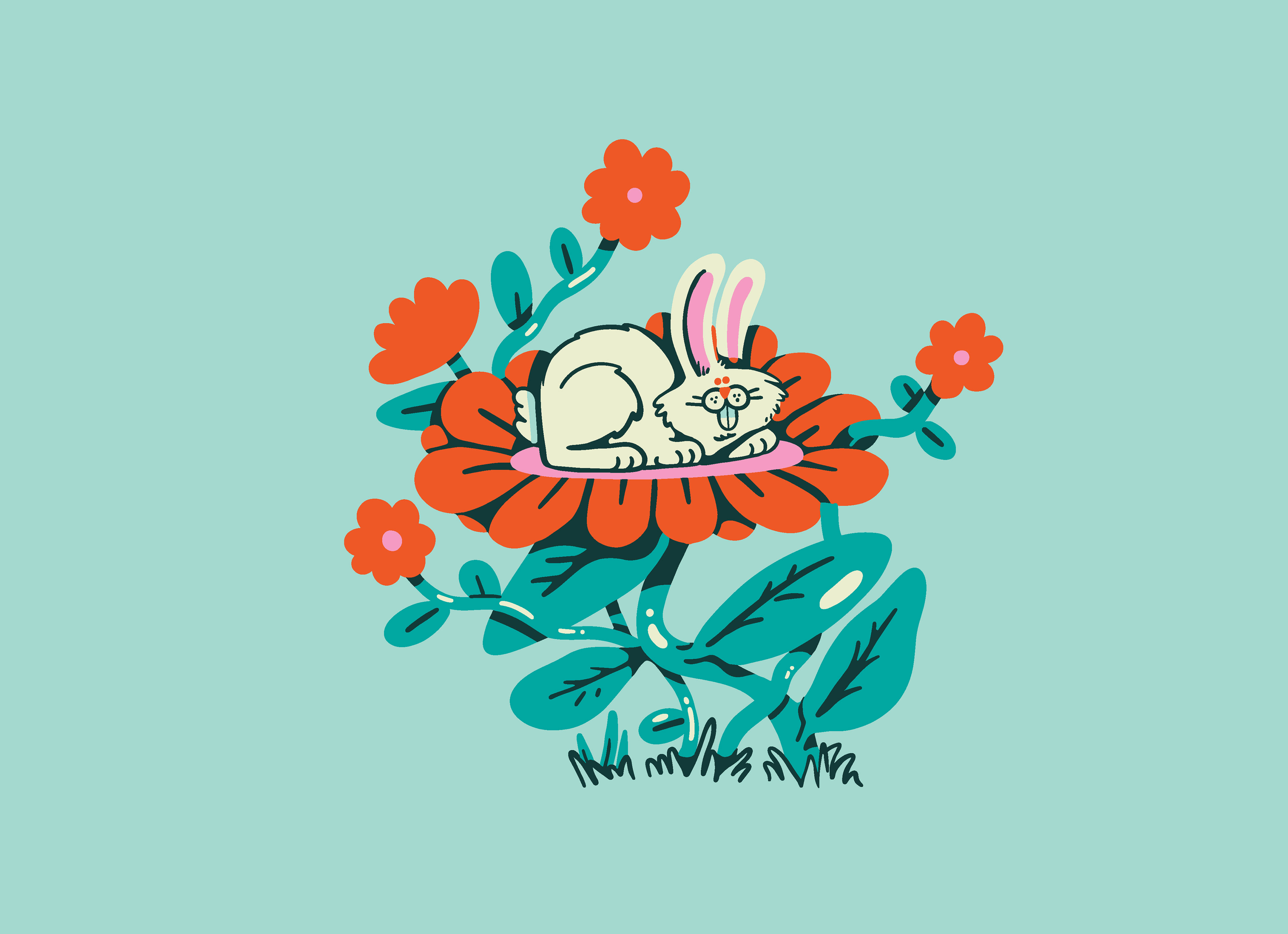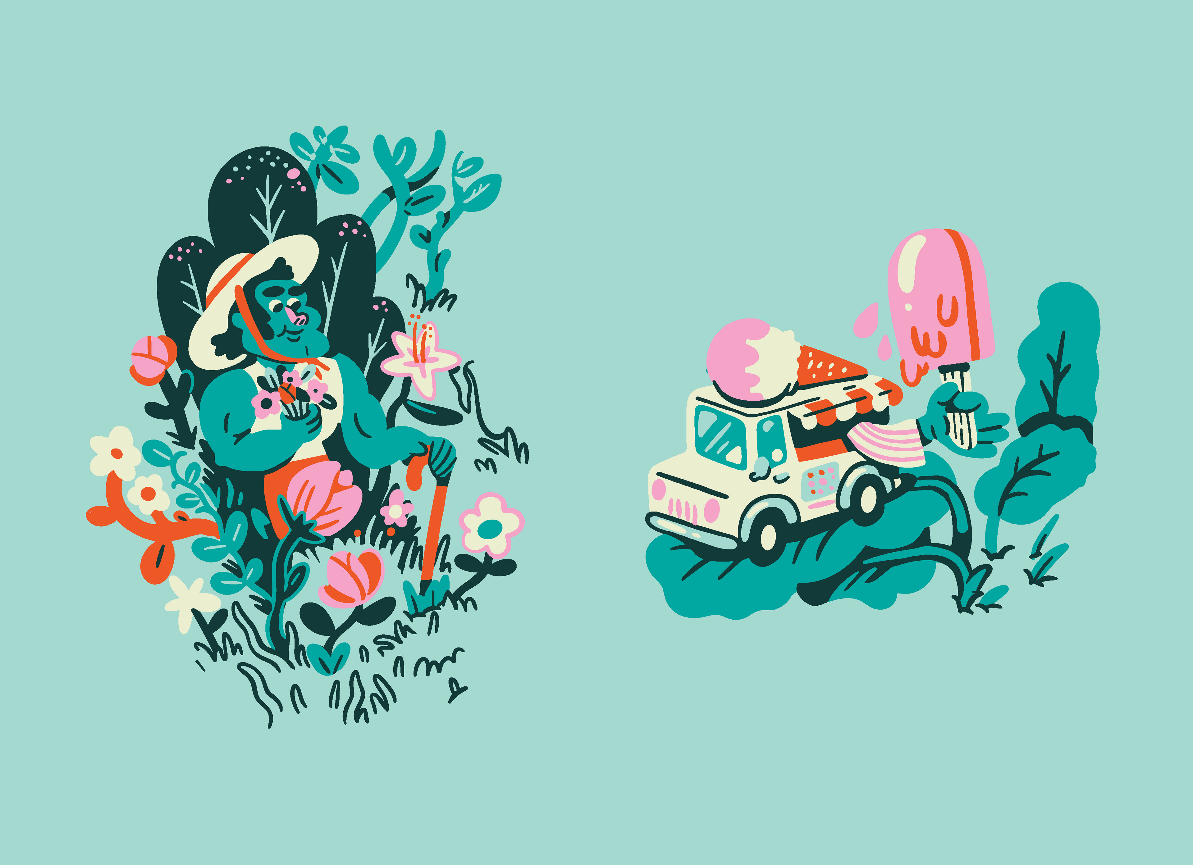 I think using more solid blocks of color and saving the outlines for details and shadows creates a playful, professional feel. With such a dense illustration, the outlines almost became too busy and harsh to look at so I'm excited they were down to experiment with another approach at this stage in the process. I still very much love outline-heavy work, but I'm never against doing something a little differently when something feels right for a project, and this one certainly called of this unconventional approach.