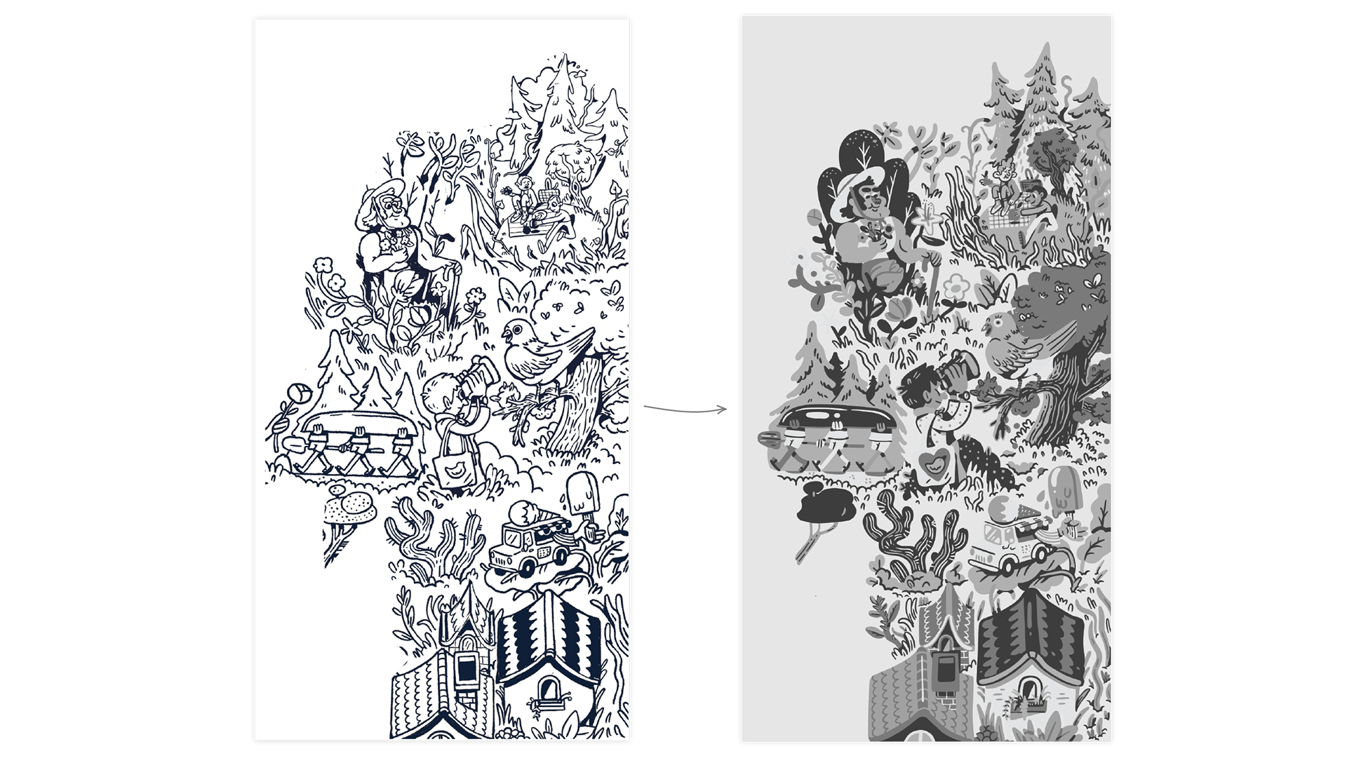 After completing the full sketch, it was hard not to see just a big coloring book. Which is fun, but unfortunately not the vibe I was going for. So I proposed using a style with fewer outlines and tested the idea on a section of the sketch.