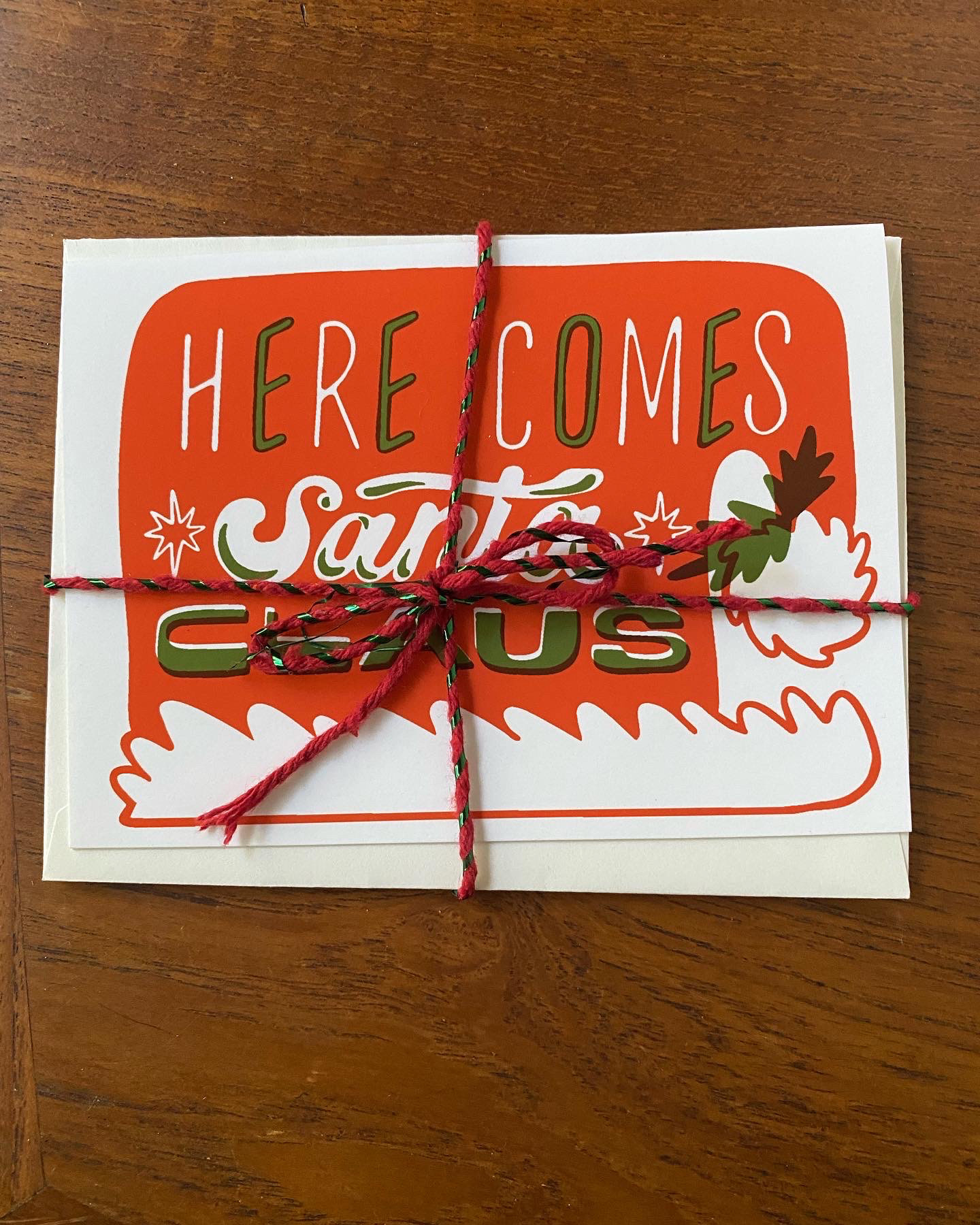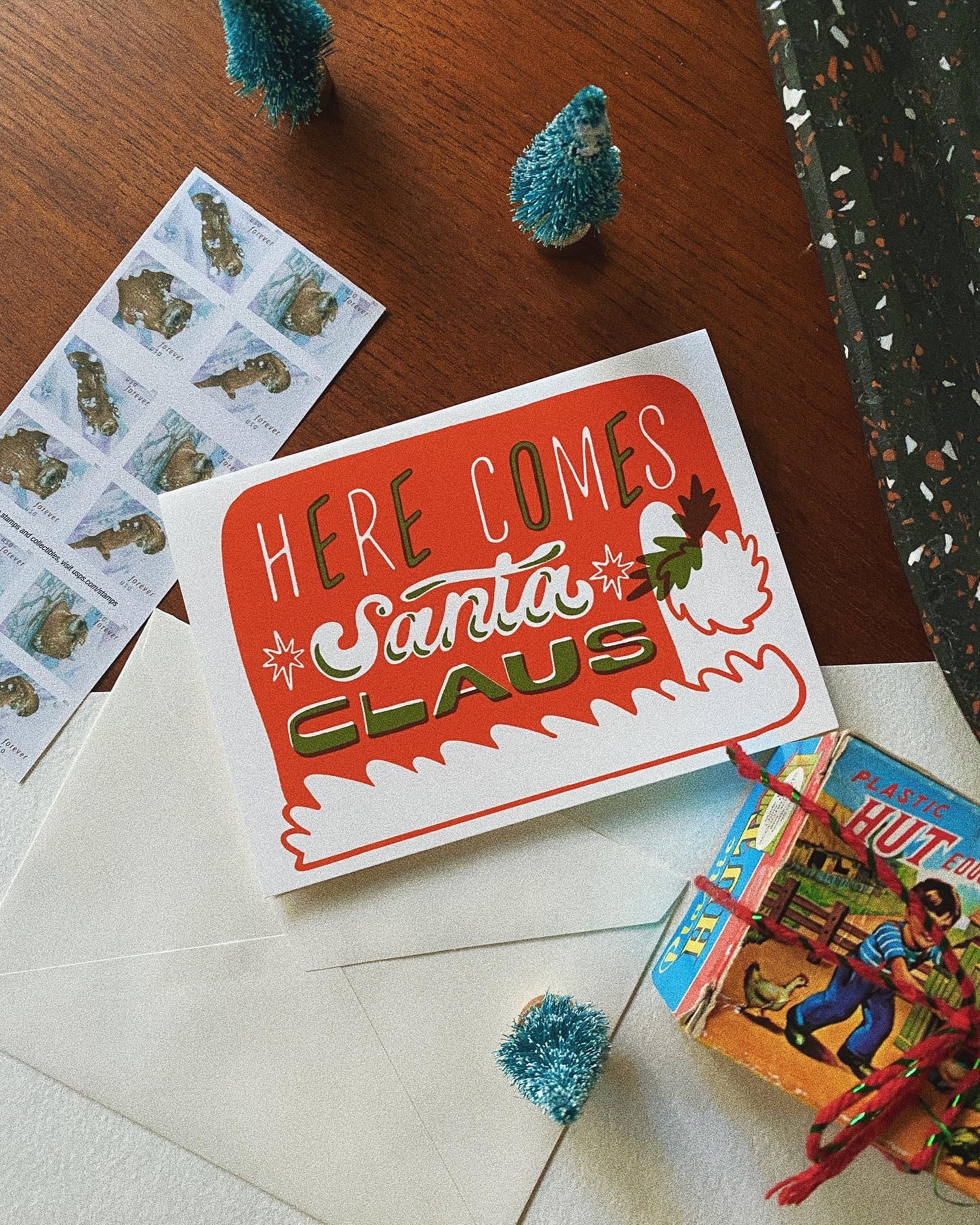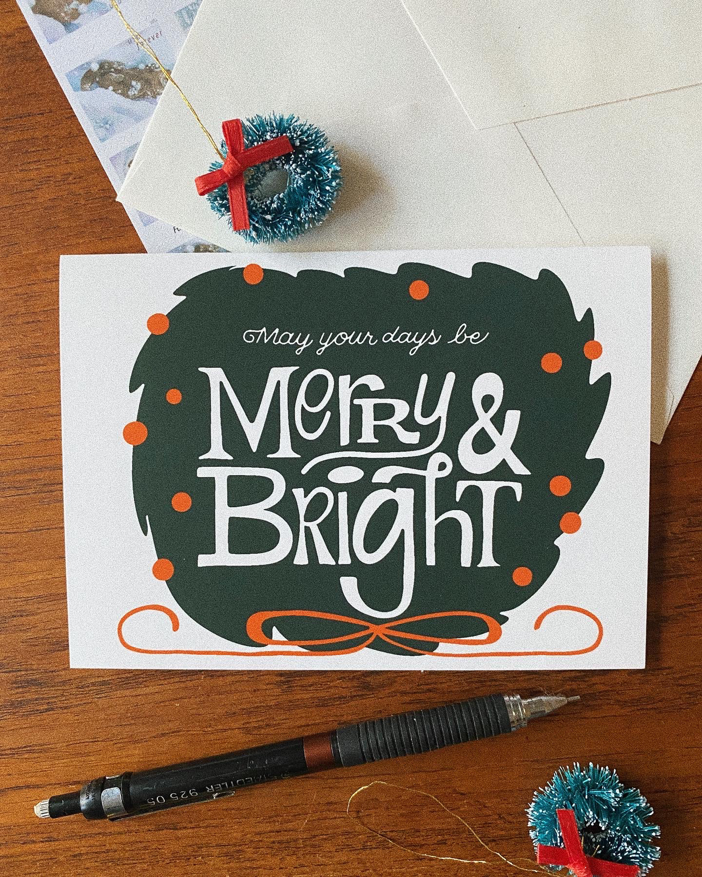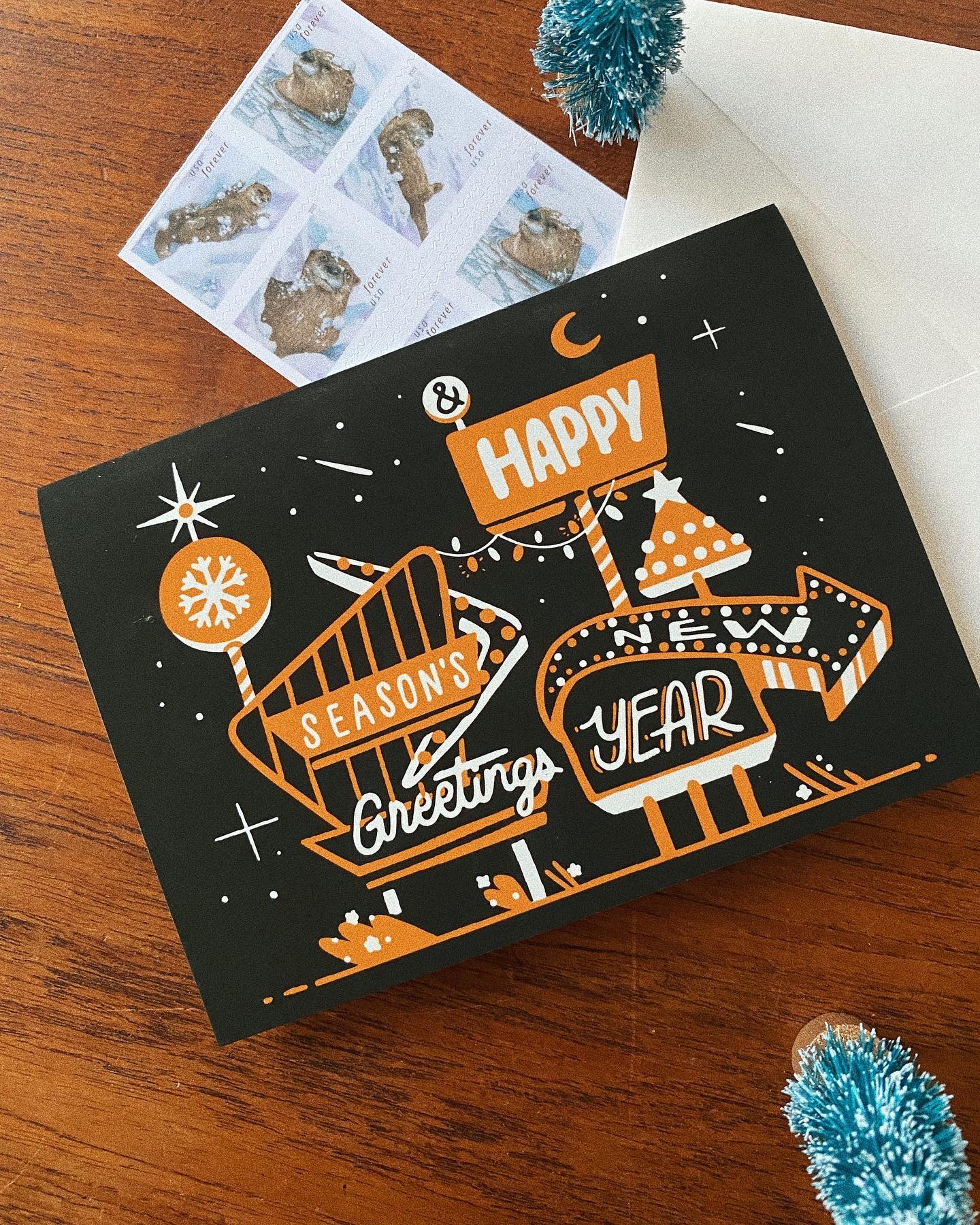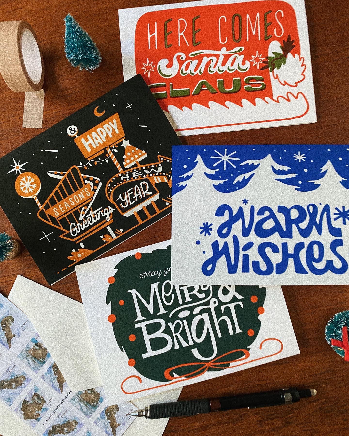 These are some holiday cards I designed and printed to sell at an art market in December. The cards showcase hand-lettering and illustrations in a vintage inspired style.