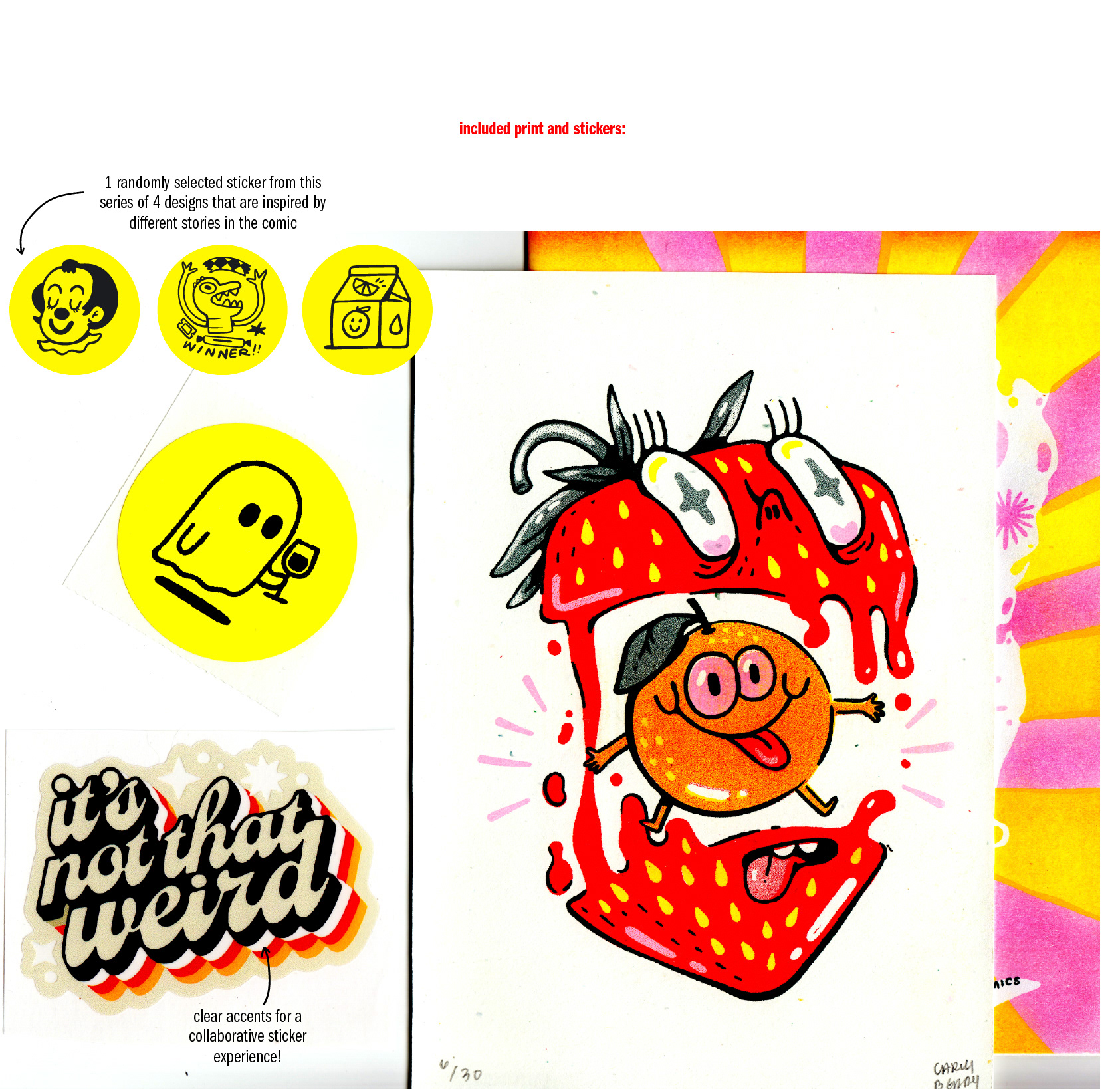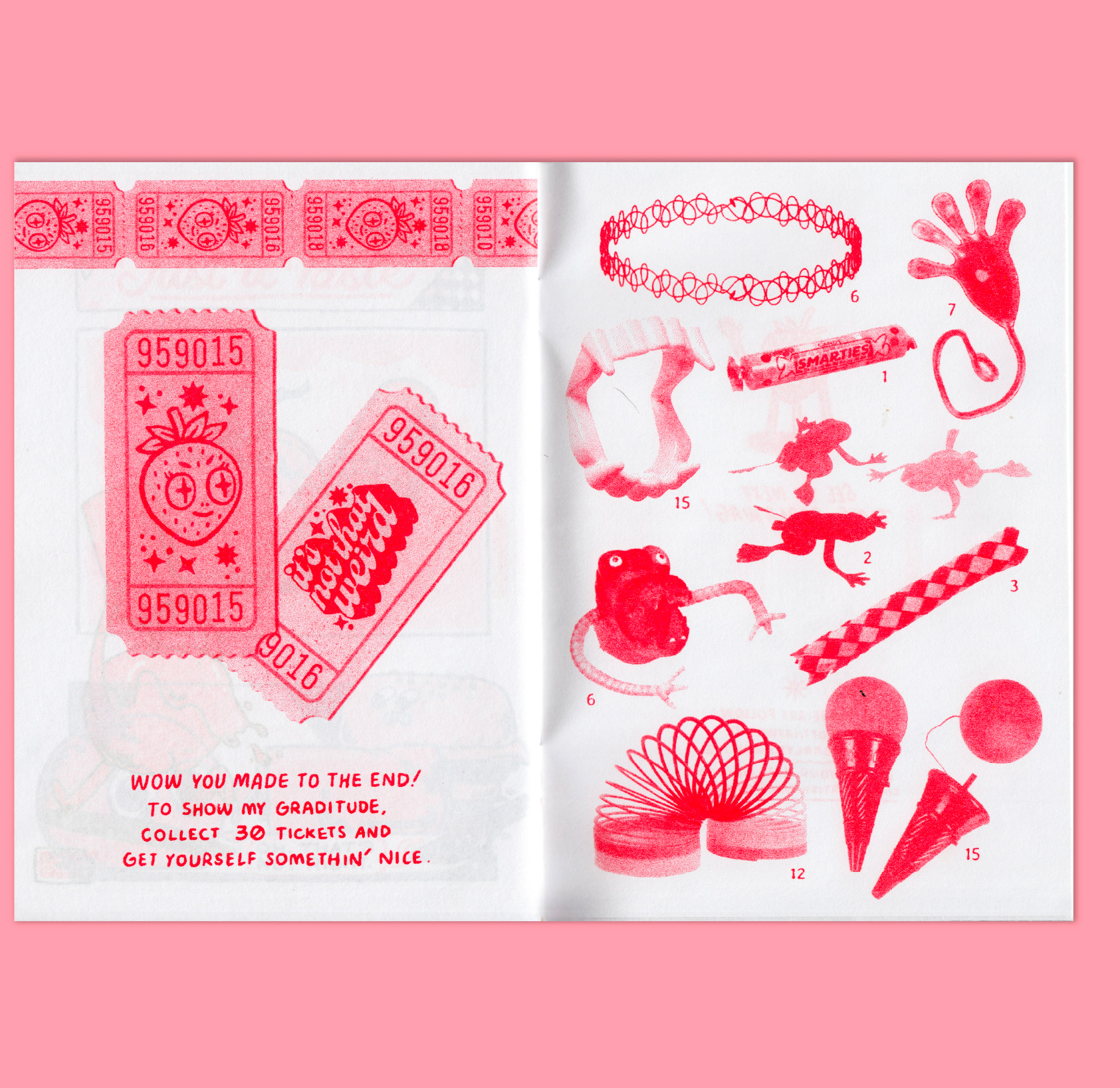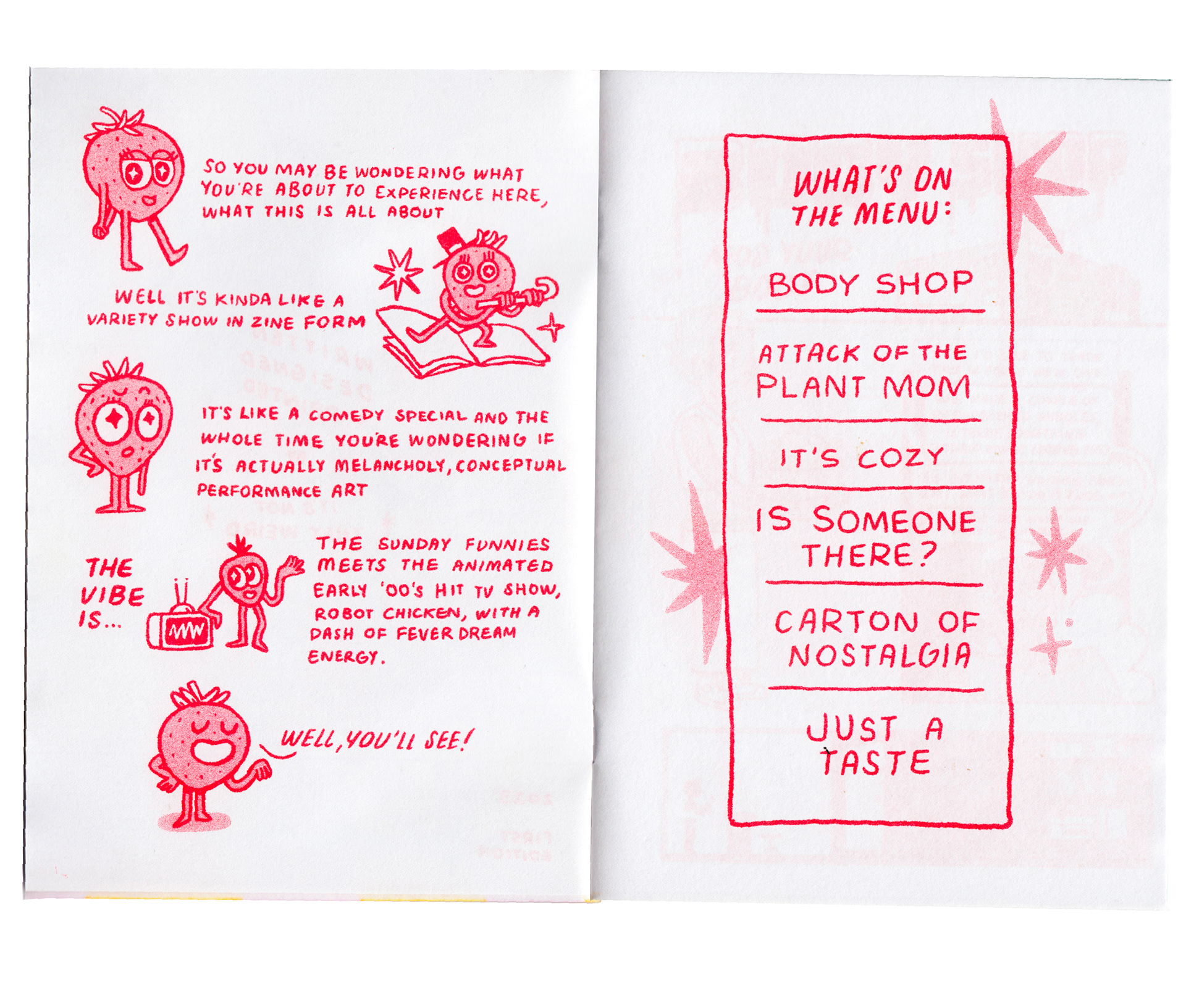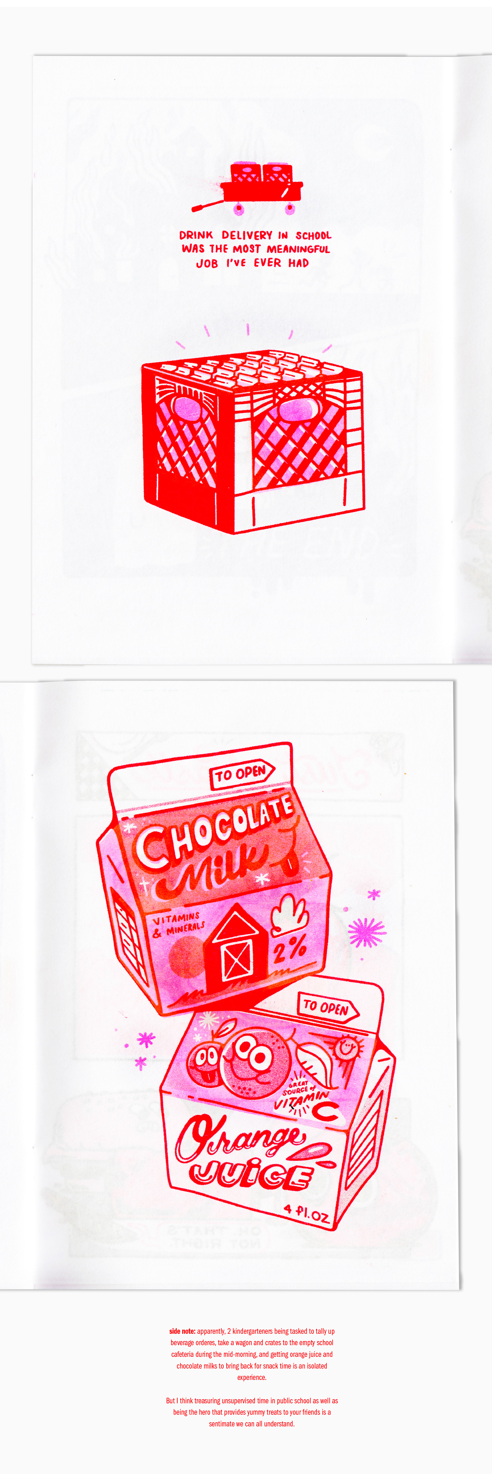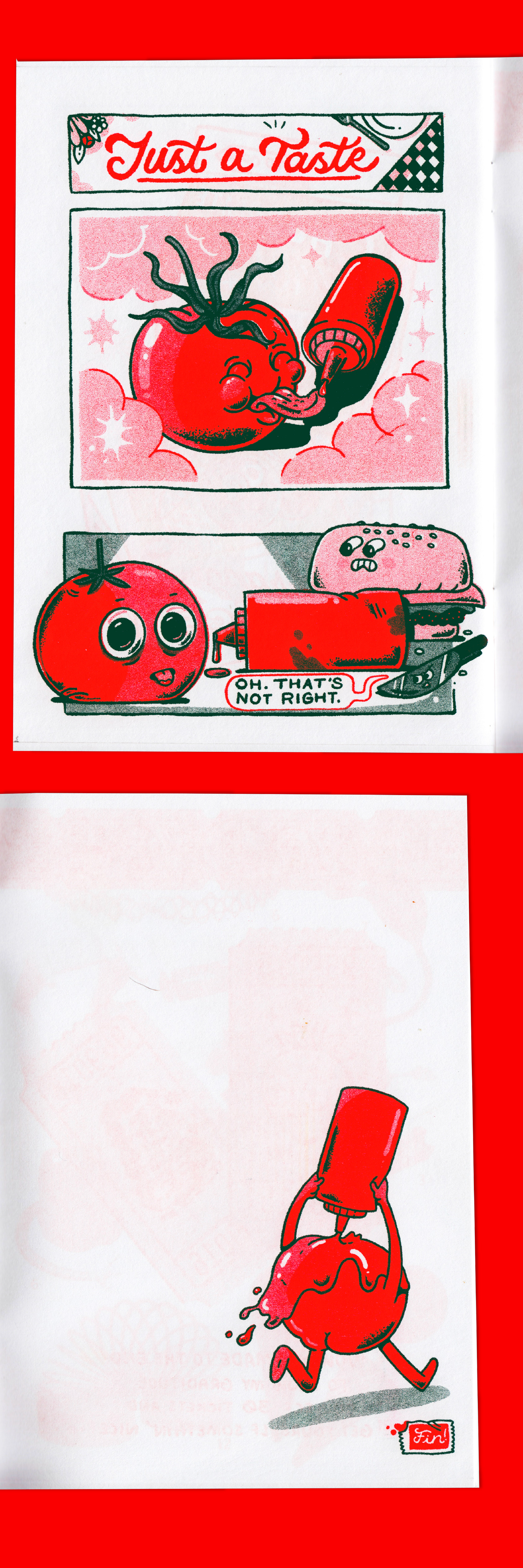 This was a personal project—a comic book I wrote, illustrated, and riso-printed! It's a compilation of a couple of short comics. The first page explains the format the best, so I'll let that guide you!