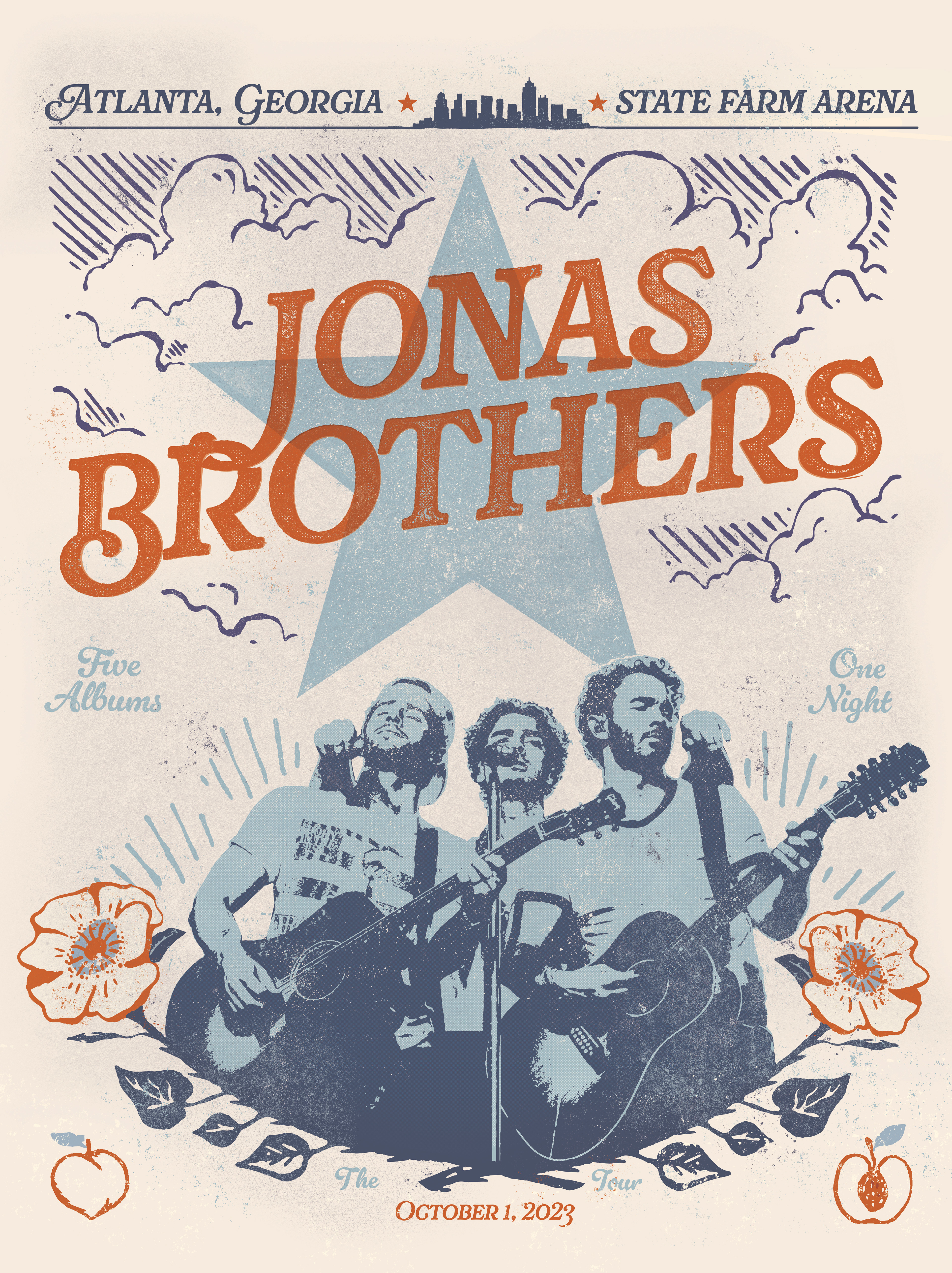 I worked alongside the people at Collectionzz to create a series of posters, 6 total, for the Jonas Brothers' 2023 tour. They wanted designs that felt retro and had an American vibe with images of JB. I had a lot of fun cranking out different designs and being able to stretch my skills in texture. Half of the posters include hand lettering.