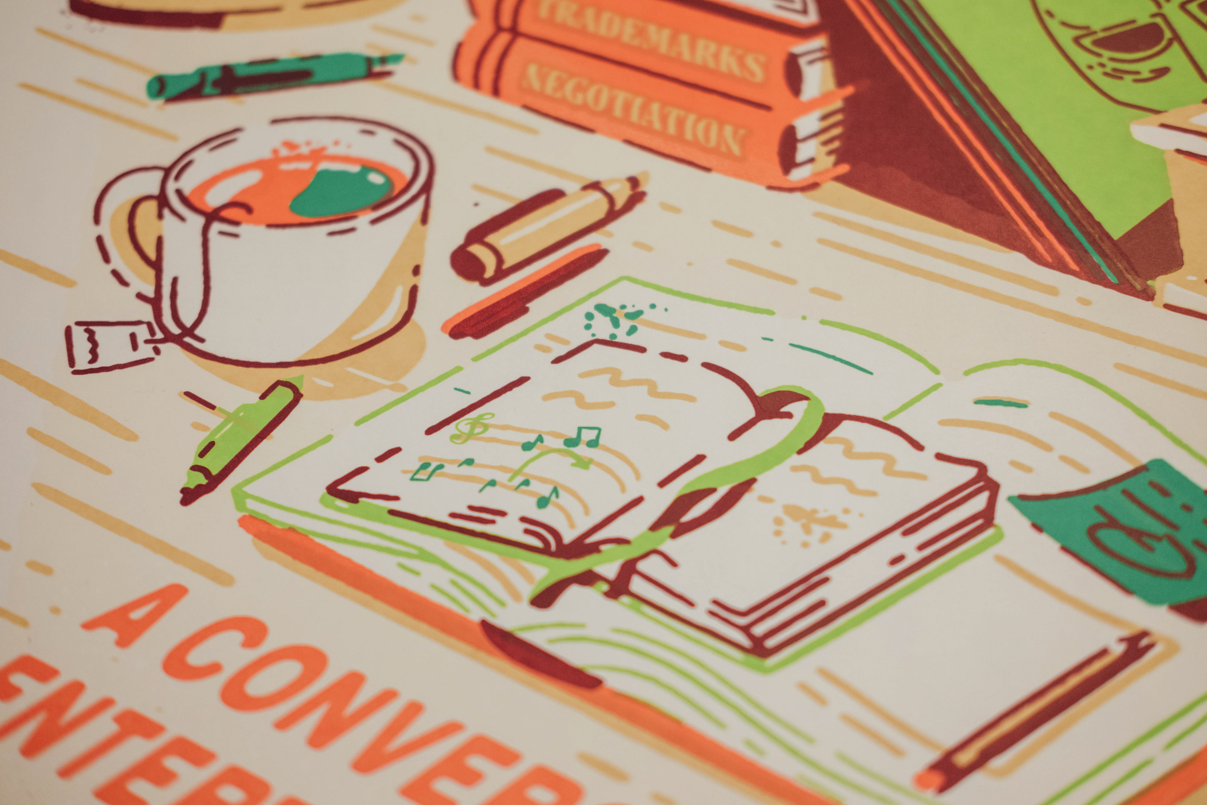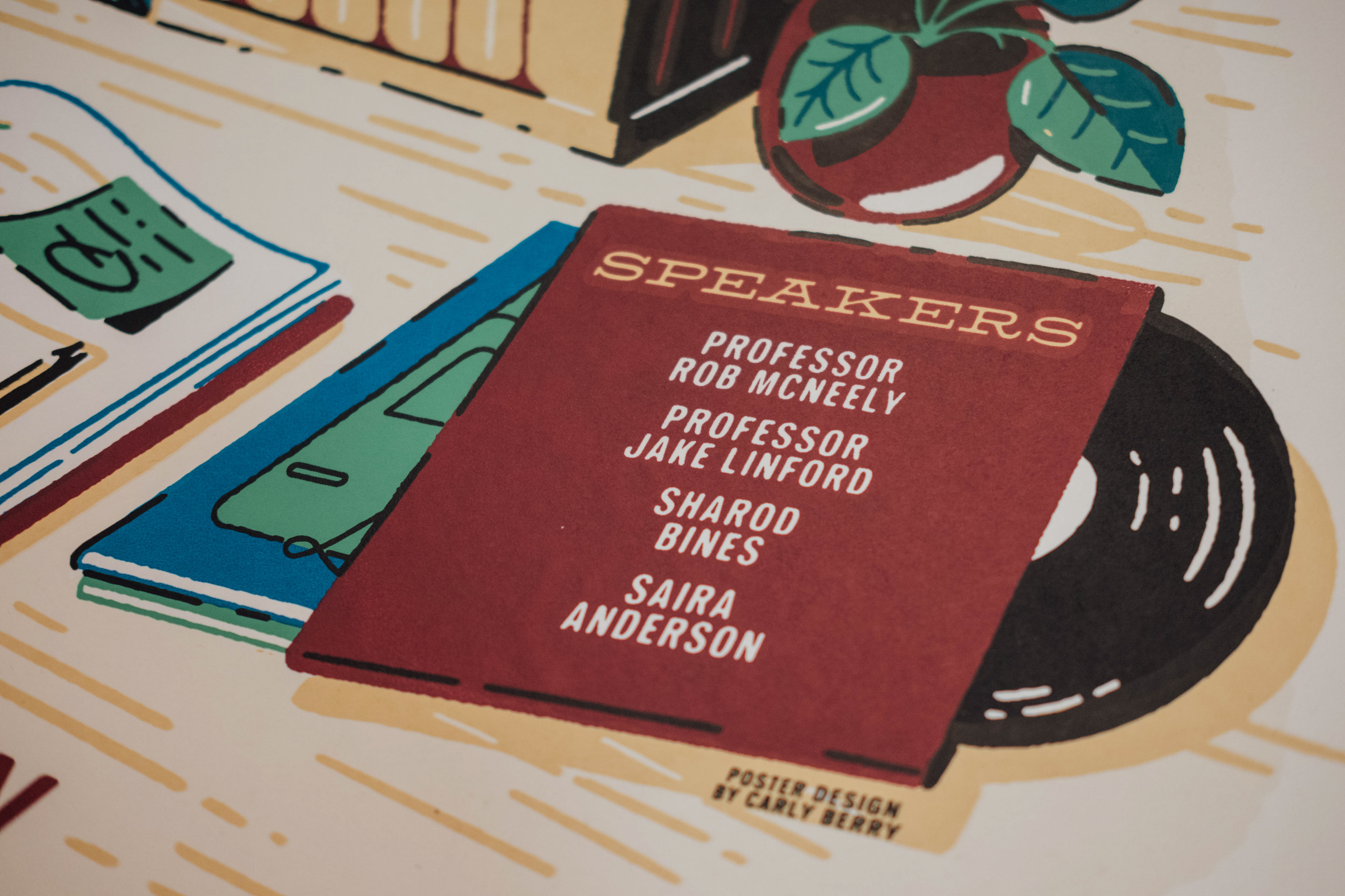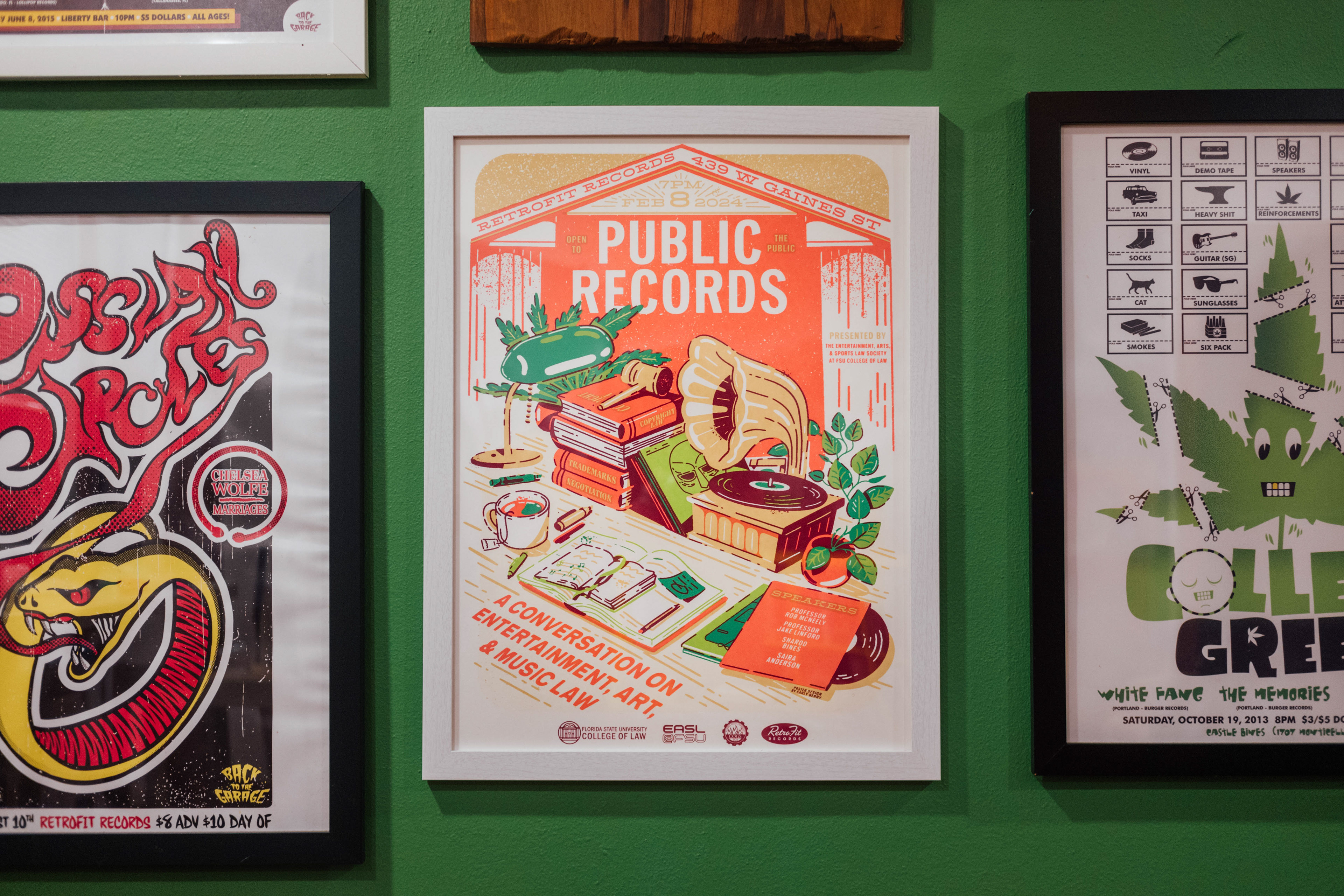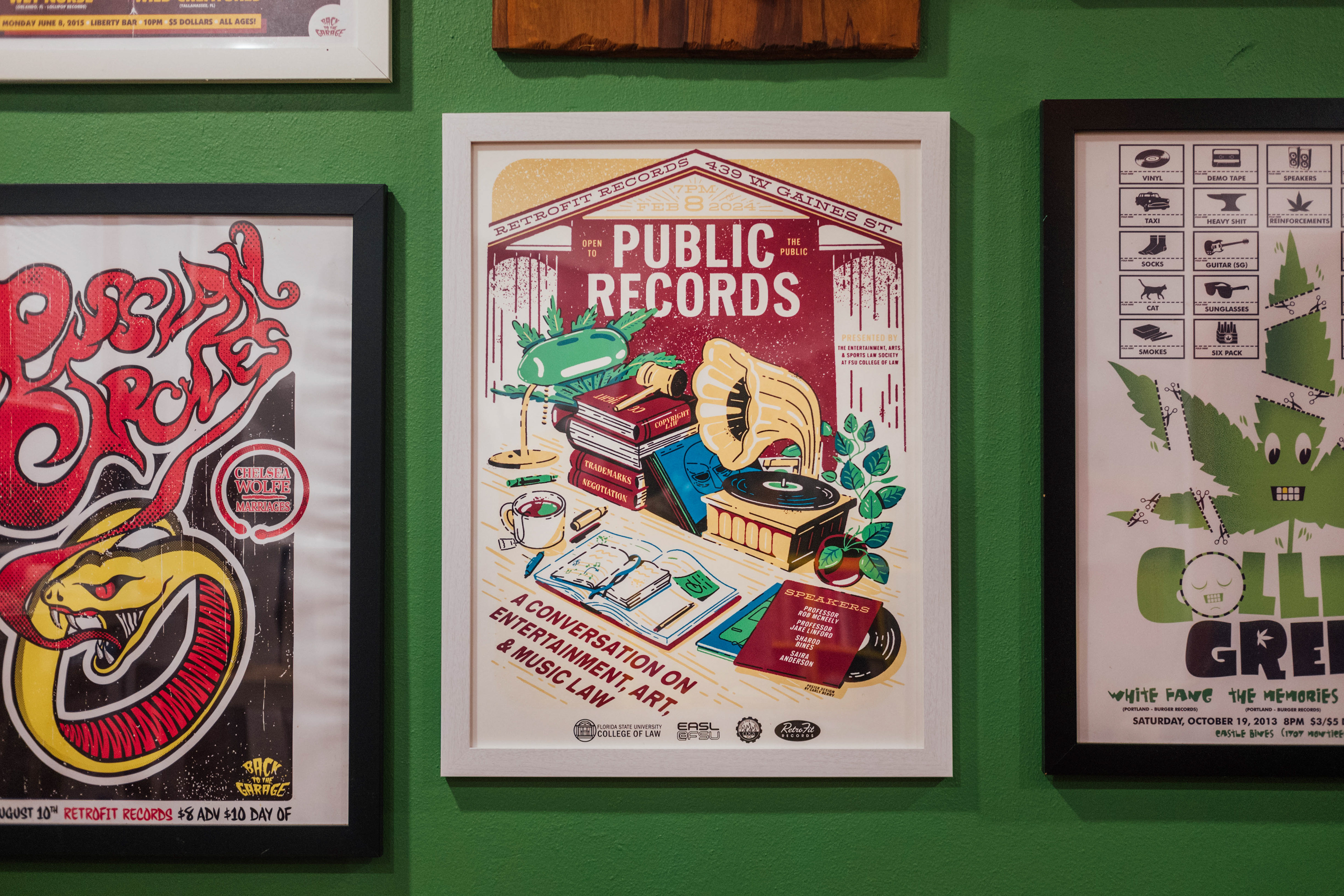 This unique event brought together two worlds: a record shop and law school. It was a challenge to highlight both of these equally in the same design and fit in the University colors, garnet and gold, in a pleasing color palette.