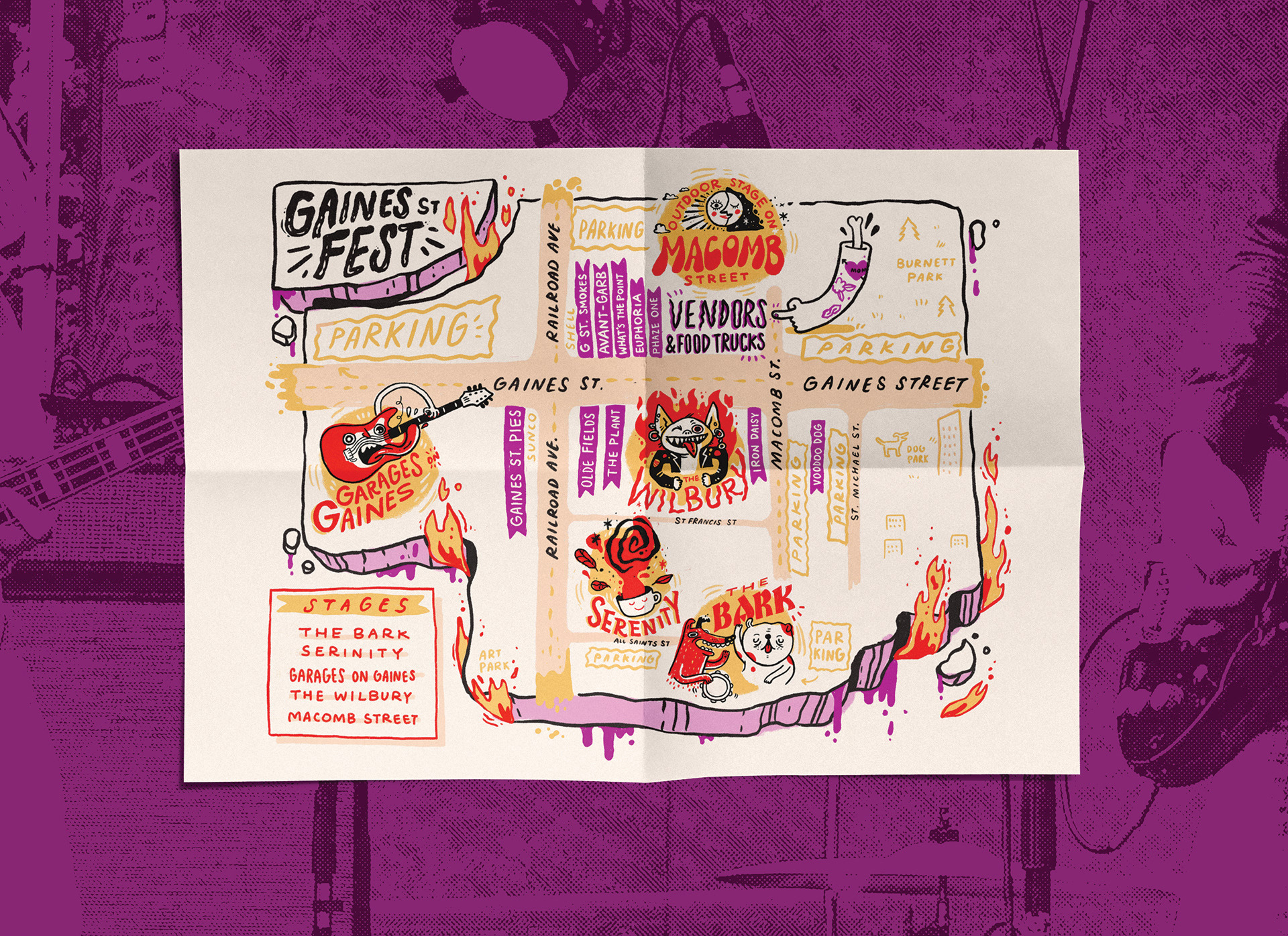 Gaines Street Fest is an annual event with a lineup of artists at different music venues in and around the Gaines Street area in Tallahassee. They also have a vendor section ranging from art, clothing, antiques, and hella tasty vegan deserts. Besides being a vendor for the last 4 years, in 2019 I was the designer behind the illustrated map. I created little personas for each stage, and fleshed it out with streets and parking areas. The little illustrations inspired by some of my favorite places around town are really my heart and soul. I’m all about the “cute but also kind of grungy” style and capturing the vibe of a city.