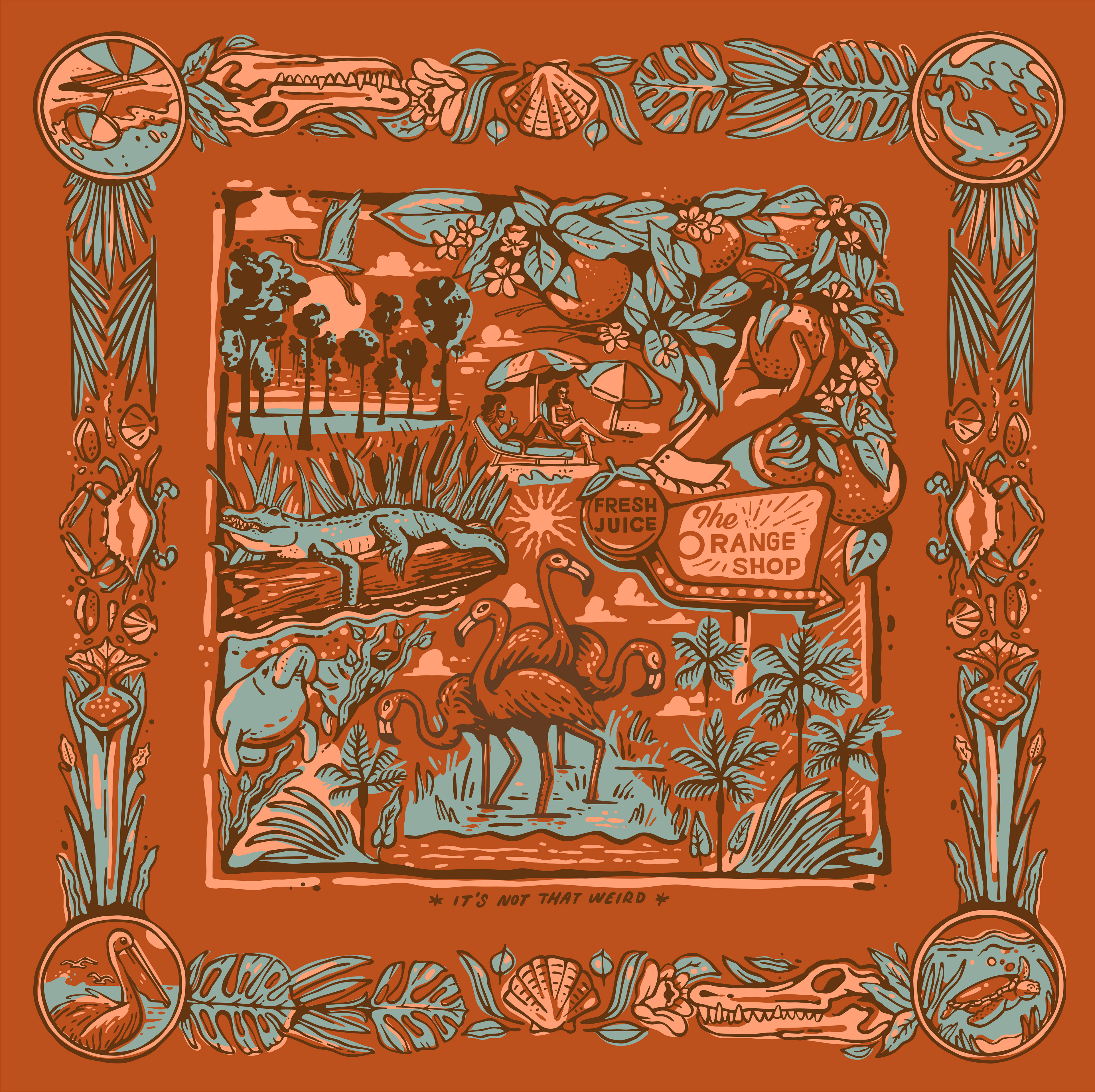 A bandana design inspired by vintage Florida ephemera. I wanted the ink layers to be intentionally off-register to mimic that old print job look. I also wanted the line quality to feel blobby, as if it was done with a brush pen and ink. This was a personal project and is available via my online shop
